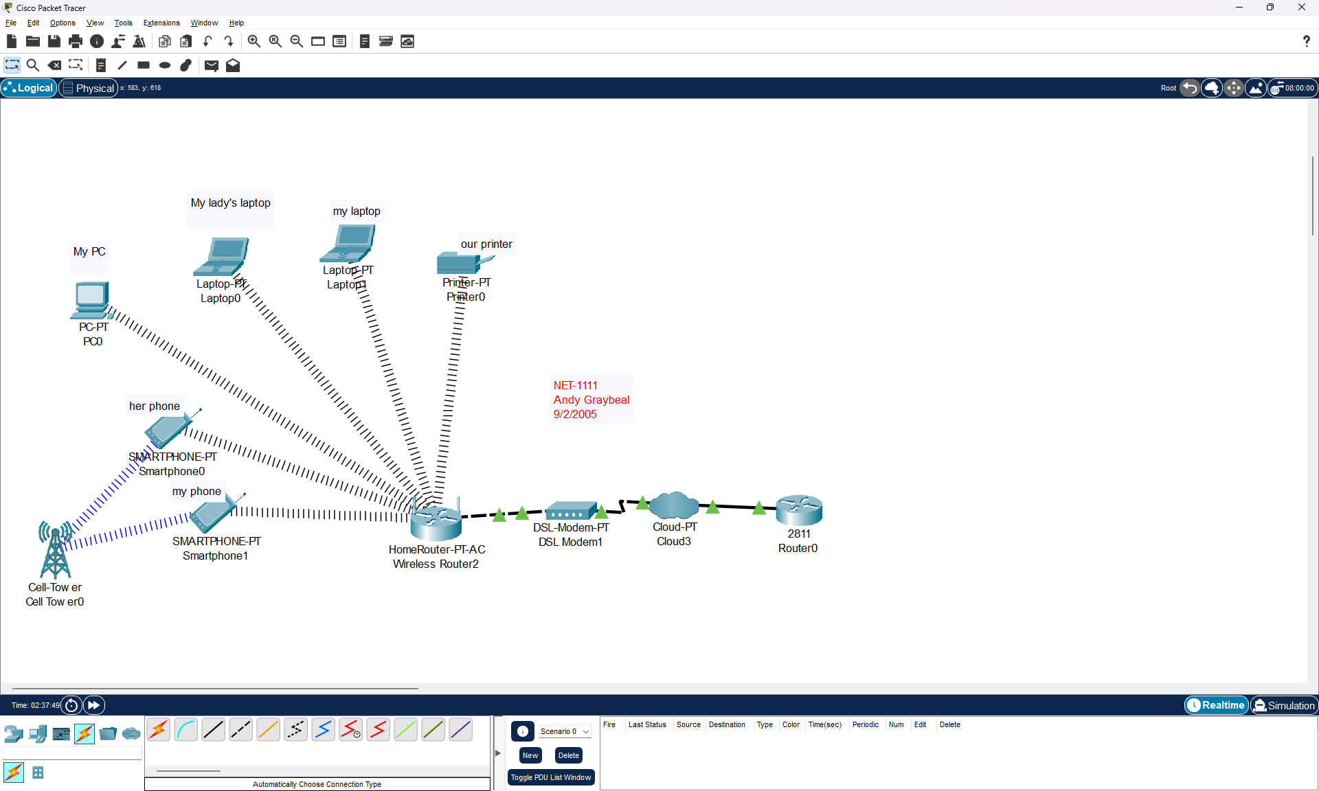 We were tasked to represent our home network in Cisco Packet Tracer. I couldn’t find a smart tv and I suppose there are bluetooth devices, like speakers that aren’t being represented.