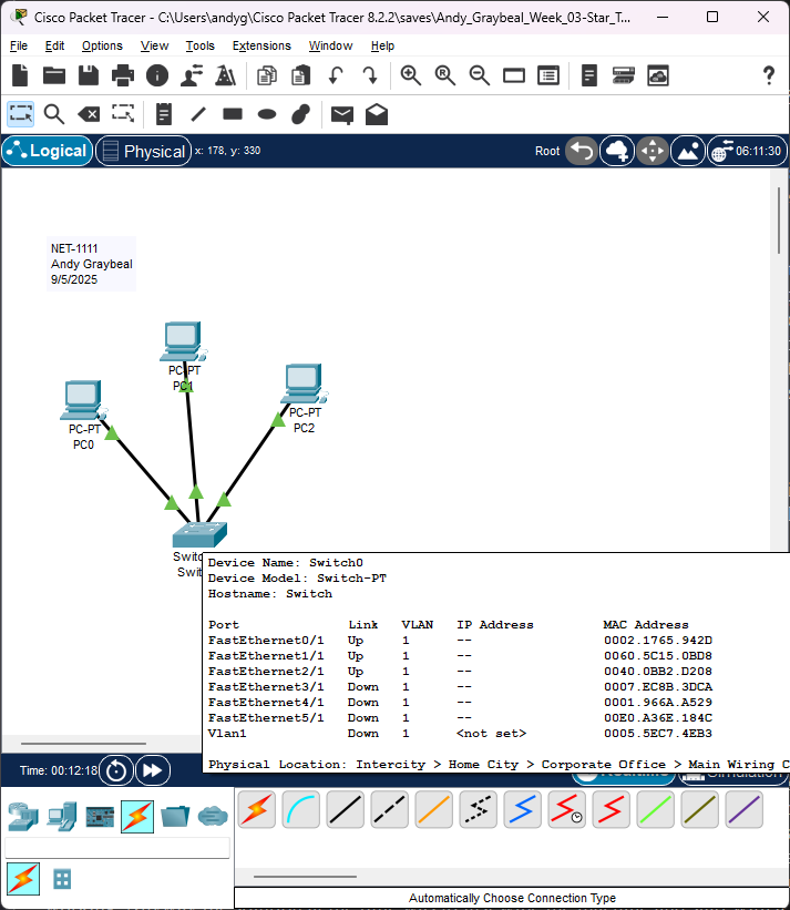 Earlier this week, in a lab, we were tasked to make a network that uses Star Topology and to verify L2/L3 connectivity using Cisco’s Packet Tracer application. The prompt for this entry is this: