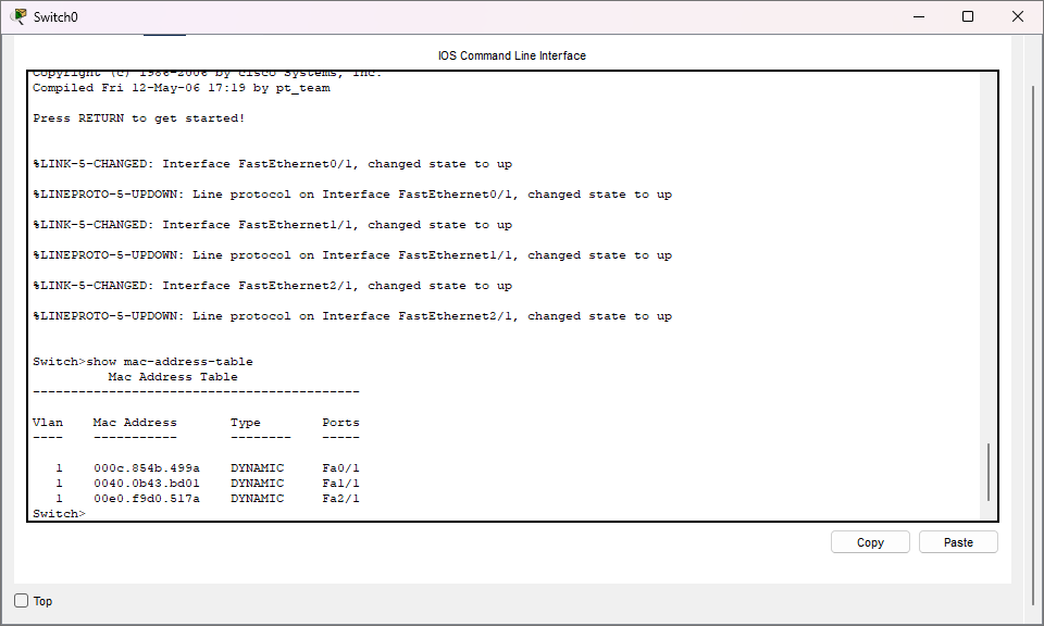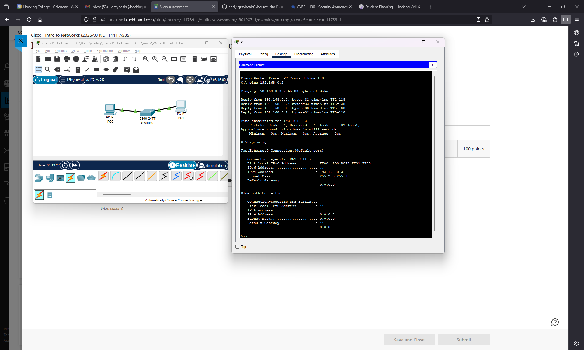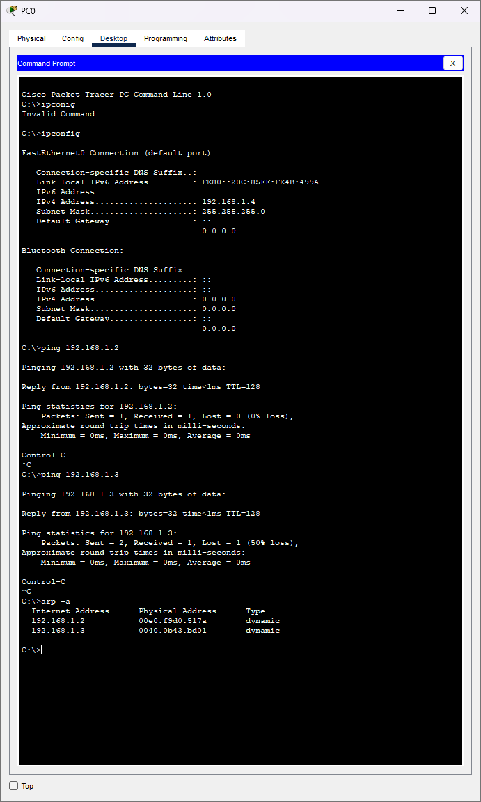 On the PC’s CLI I used commands like “ipconfig” to show the configuration of the network interface, “arp” to display the MAC address to IP address translation (Layer 2 and 3), and “ping” to show ip connectivity (Layer 3). On the switch’s CLI I used the “show mac-address-table” command to show the MAC addresses connected to the switch (Layer 2).